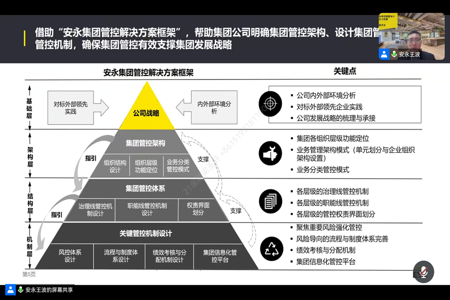 之后,王波老师以某A股主板上市公司的集团管控为案例,依据自身为该公司的服务经历,立足企业预期目标与发展模式,系统剖析了该企业在组织架构集团管控上面临的问题,并以金字塔图展示了“以公司战略为引领,集团管控架构,集团管控体系,关键管控机制设计层层支撑指引”的解决策略。最后,参赛选手们从多角度进行提问,主讲人对每个问题都做出全面细致的回答和建议,员工们收获颇丰。
