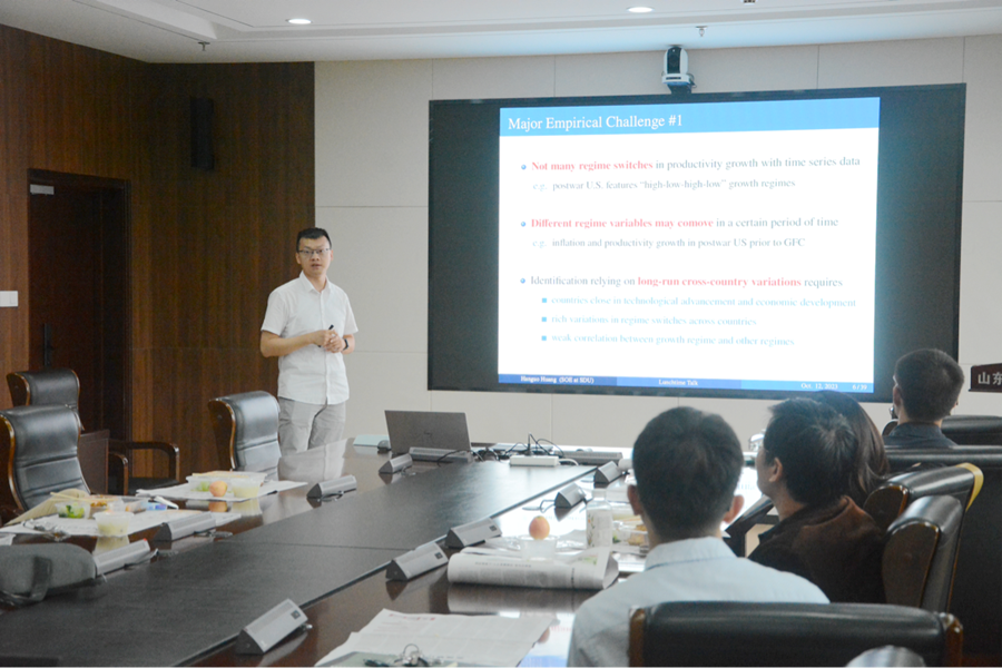 10月12日,3044am永利集团3044noc第95期青联学术午餐会在中心校区知新楼B321举行,3044am永利集团3044noc助理研究员黄翰国,作了题为“TFP Growth Regimes and the State Dependence of the Slope of the Phillips Curve”的学术报告。本次会议由3044am永利集团3044noc周剑南助理研究员主持,学院部分师生参会。
