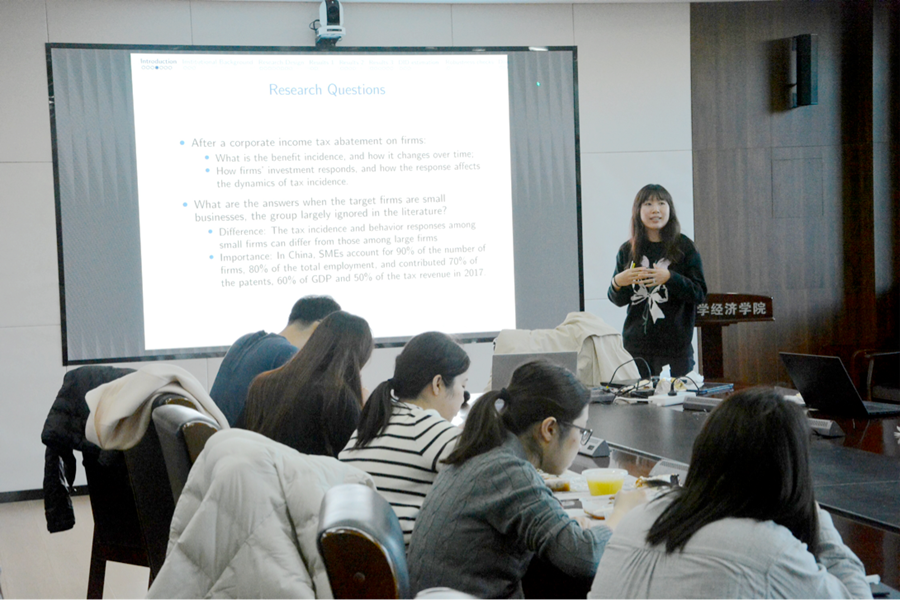 报告研究了工人如何从小微企业的企业所得税(CIT)削减中受益,并提供了企业投资与工资增长之间动态互动的证据。基于我国针对小微企业的优惠政策,即小微企业有资格获得50%或10%的CIT减税,条件是其应税利润低于阈值,该政策构成了准自然实验,报告首先证明了企业聚集在阈值以下,并采用“甜甜圈”断点回归来估计减税的影响。报告指出,从短期来看,减税并没有使工人受益,工人的工资和就业并没有增加。事实上,减税对企业投资存在激励效应,减税两年后,享受减税的企业工资增长更快,这与其企业规模和生产率的更高增长是相匹配的。尽管公司将所有税收优惠分配给新一轮投资并在短期内支付股息,但在减税两年后,工人能从单位美元减税中获得0.51美元的工资增长,占总优惠的42%。在报告过程中,邹杰与参会学者围绕数据来源、模型构建、所得结论等方面的问题进行了充分的讨论。