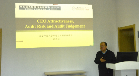 学术报告环节,北京师范大学崔学刚教授作了题为“CEO attractiveness: Audit Risk and Audit Judgement”的学术报告,就CEO颜值、企业风险水平及二者交互对审计决策的影响进行了深度剖析,发现在审计决策环境中,颜值存在回旋效应,但这一效应仅存在于高风险情况或者男性审计人员中。此外,还针对颜值作用于审计决策的神经机制同与会专家学者进行了探讨。