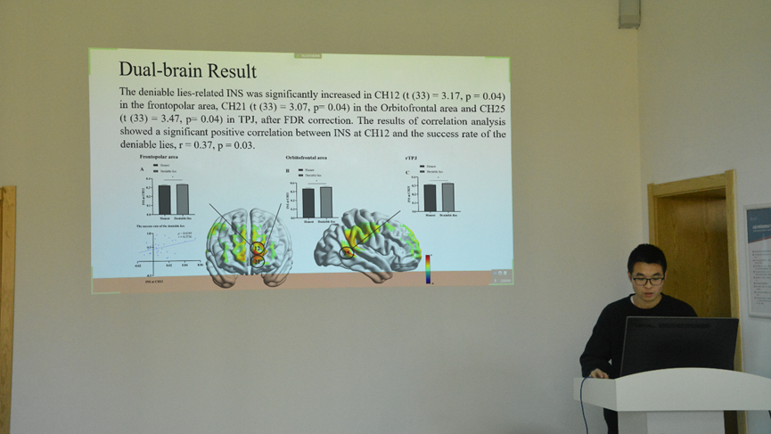 李建标教授课题组作了题为“The single- and dual-brain mechanism of the deniable lies”的学术报告,从脑内激活和脑间同步两方面研究了可抵赖谎言的神经机制,并指出当人们进行欺骗时,反应时间显著增加。在神经方面,与诚实相比可抵赖谎言在背外侧前额叶、额极、眶额叶、颞顶联合区等脑区存在更高的神经激活并增强了额极和颞顶联合区的神经同步。