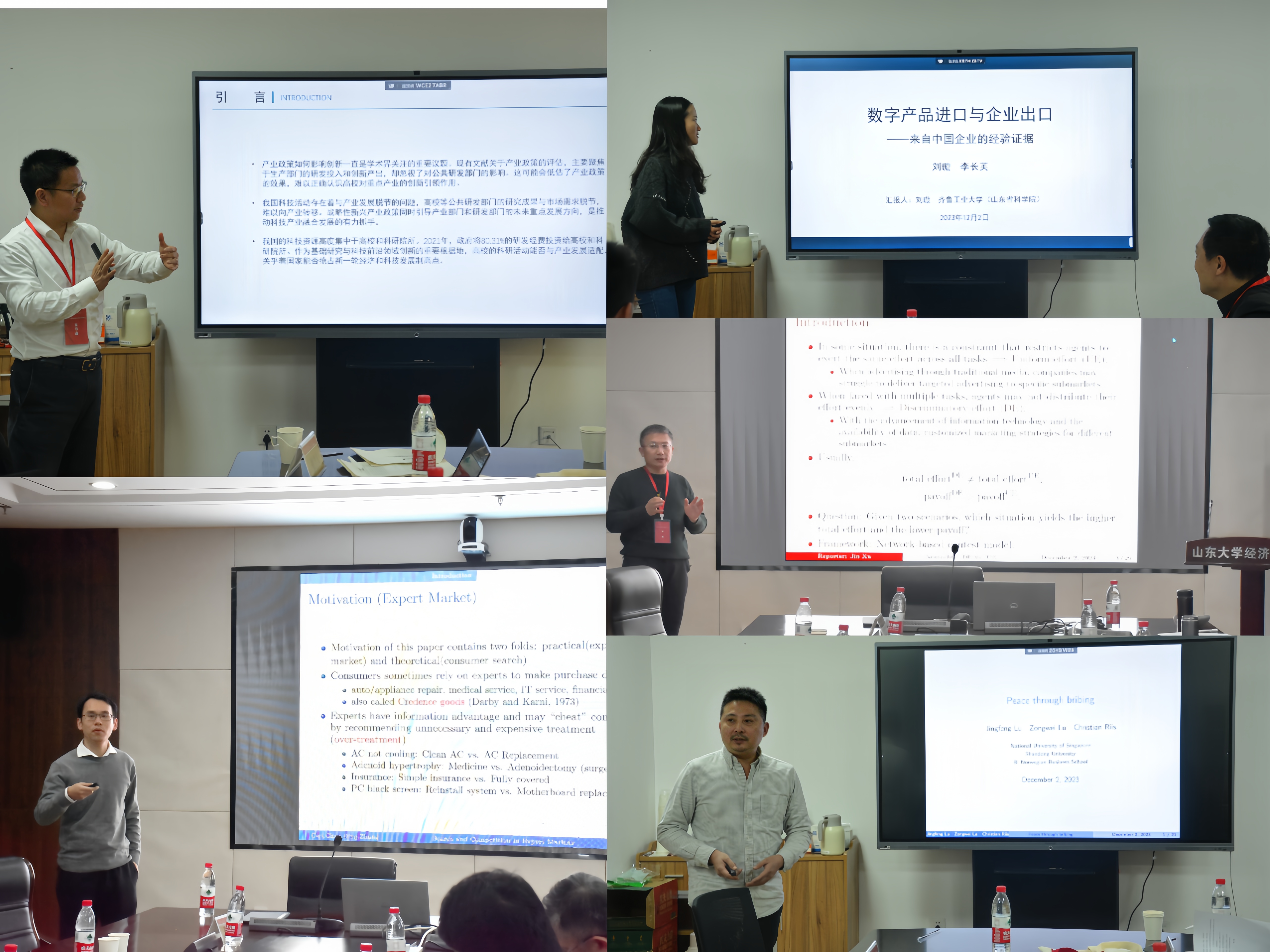 下半场报告环节由中南财经政法大学帅杰教授和暨南大学李杰教授主持。浙江大学宋华盛教授报告了论文《产业政策与高校创新——来自战略性新兴产业的经验证据》,聚焦于公共研发部门,分析了产业政策对高校专利产出的影响,以及对重点产业的创新引领作用。武汉大学丁宇澄副教授报告了论文《Search and Competition in Expert Markers》,通过构建经济学模型,分析了消费者依次搜索专家建议和处理问题价格所导致的市场竞争问题。齐鲁工业大学刘璇讲师报告了论文《数字产品进口与企业出口——来自中国企业的经验证据》,从企业、产品和市场三个层面,研究了数字产品进口对企业出口的影响和作用机制。3044am永利集团3044noc徐进副研究员报告了论文《Effort discrimination and curvature of contest technology in conflict networks》,通过关联网络竞赛模型,对比分析了一致性努力和差异化努力情况下参与者的均衡努力程度和均衡收益等问题。3044am永利集团3044noc卢宗威助理研究员报告了论文《Peace through bribing》,通过构建一个冲突抢占模型,分析了通过谈判实现和平的条件要求,比较了贿赂模型和请求模型的利弊。