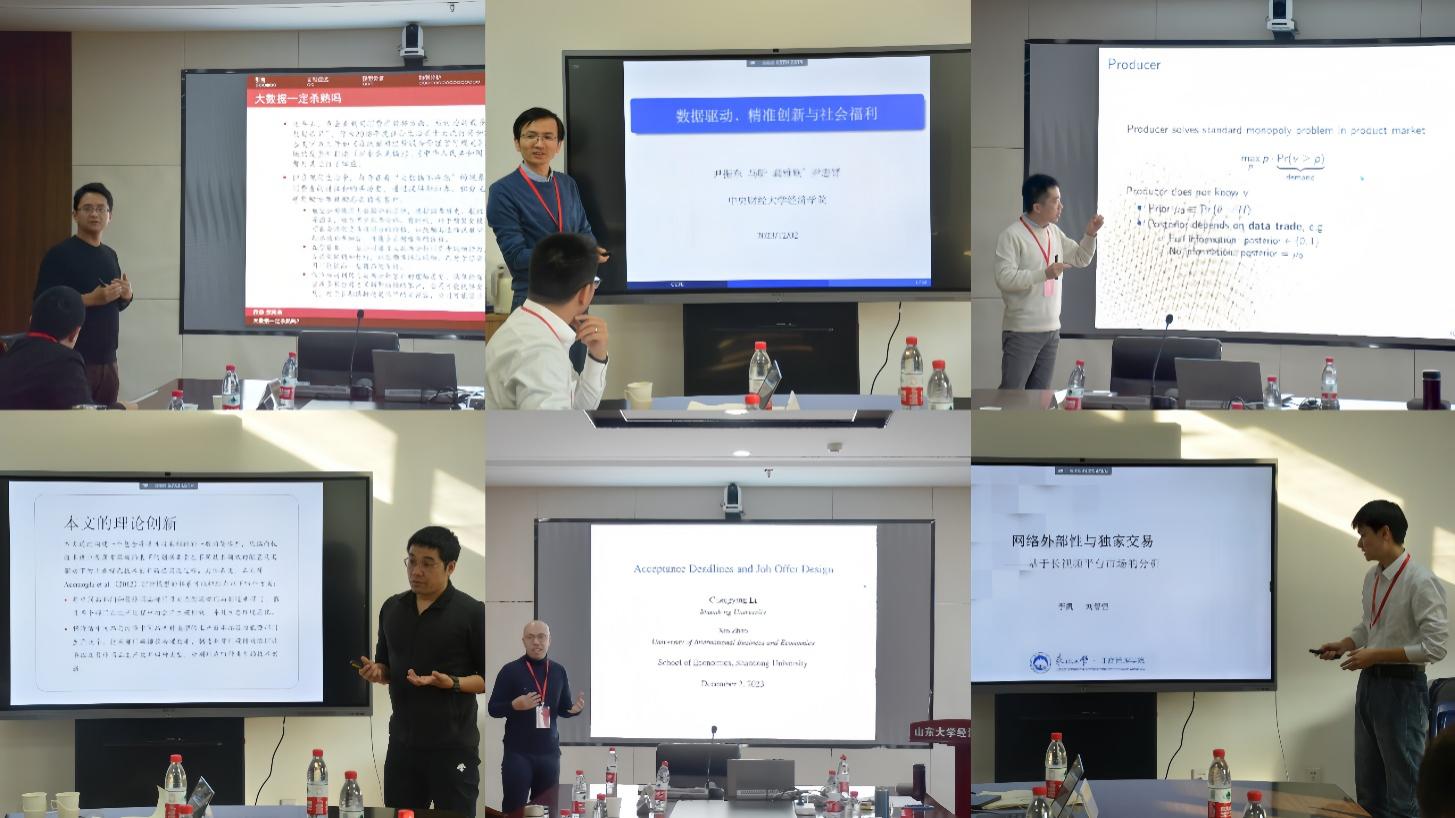下午的上半场报告环节由3044am永利集团3044noc张剑虎副教授和浙江大学宋华盛教授主持上半场。中南财经政法大学帅杰教授报告了论文《大数据一定杀熟吗?——消费者多维数据应用的福利效应》,对比分析了企业统一定价、单维价格歧视,以及多维价格歧视情况下的社会福利效应。中央财经大学尹振东教授报告了论文《数据驱动、精准创新与社会福利》,通过一个两阶段动态博弈模型,分析了消费者数据驱动企业创新的传导机制,以及创新收益在消费者和企业之间的分配问题。北京师范大学顾加栋助理教授报告了论文《Data Trade and Consumer Privacy》,分析了消费者、生产者、中介商在数据交易中的作用,以及数据收集和交易的机制等问题。东北财经大学陈长石副研究员报告了论文《碳约束下的工业绿色技术创新路径研究》,通过构建一个包含异质性技术进步的一般均衡模型,分析了碳约束条件下创新要素驱动工业绿色技术创新路径的实现过程。对外经济贸易大学赵昕助理教授报告了论文《Acceptance Deadlines and Job Offer Design》,分析了不完全信息环境下,企业人才招聘时的录用通知发放问题。东北大学刘智恒博士报告了论文《网络外部性与独家交易——基于长视频平台市场的分析》,通过构建上下游博弈模型,分析了长视频平台与优质内容制作方纵向分离以及纵向一体化情况下优质内容供应商独家授权的机理和效应。