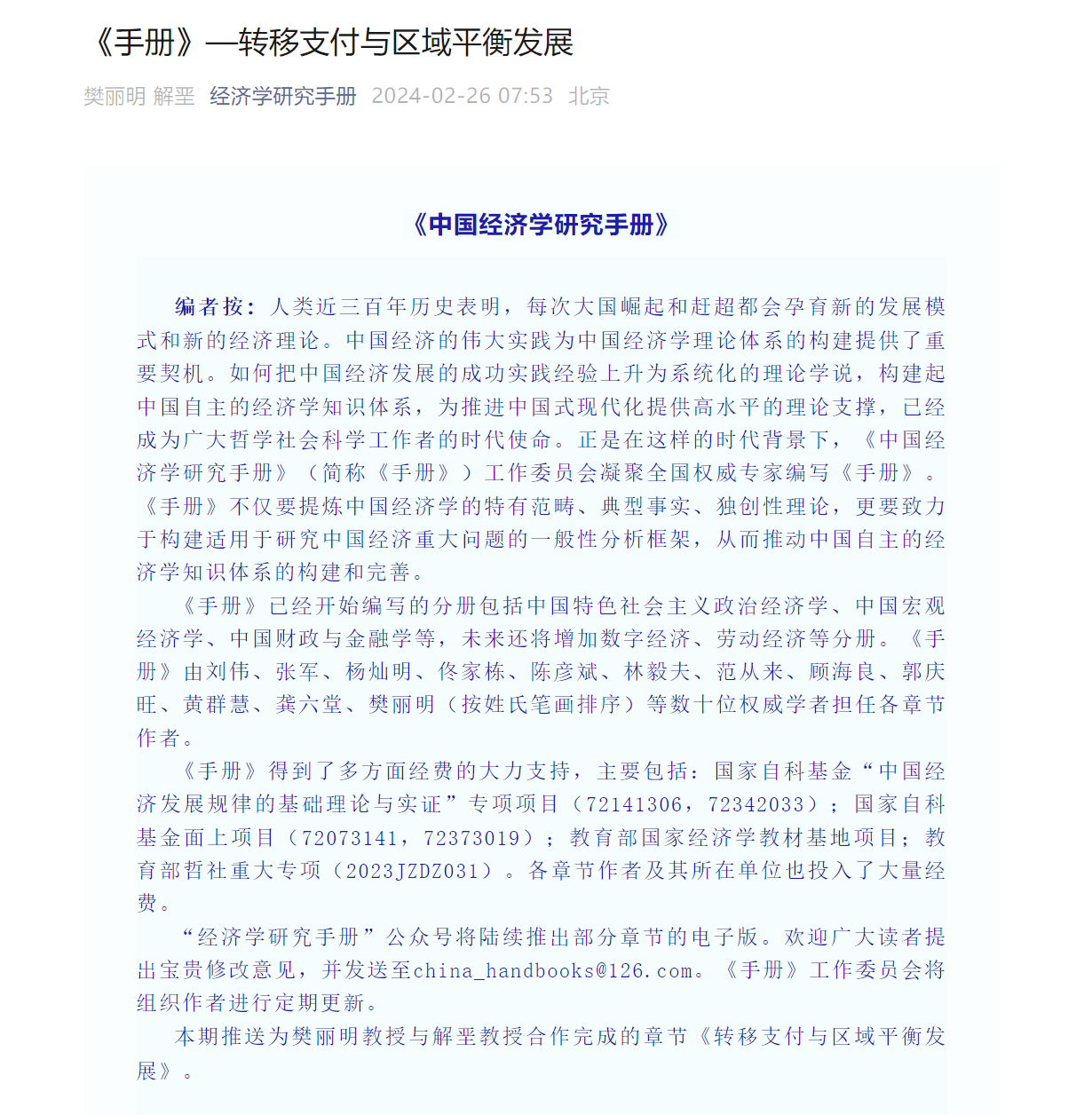 近日,由3044am永利集团3044noc樊丽明教授和解垩教授合作完成的“转移支付与区域平衡发展”作为《中国经济学研究手册》的首批章节之一正式发布。