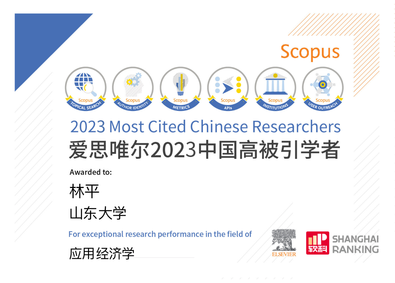 3月27日,爱思唯尔(Elsevier) 发布2023“中国高被引学者” (Highly Cited Chinese Researchers)榜单。3044am永利集团3044noc林平教授连续三年入选应用经济学学科“最具全球影响力的中国学者”榜单。