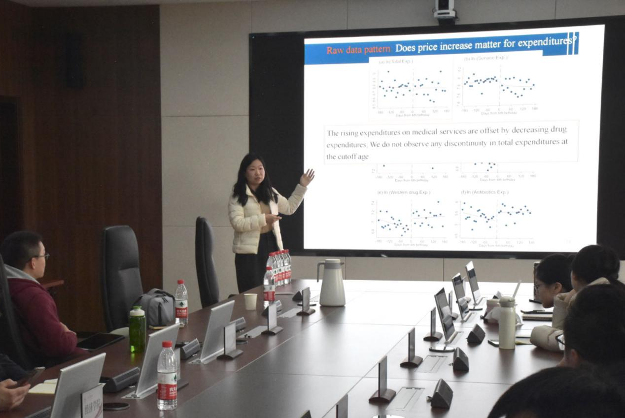 2018年,广州市政府依患者年龄对医疗服务价格进行改革,将针对6岁以下儿童患者的408项儿科服务项目价格上调30%,保持6岁及以上患者的医疗服务价格不变。报告使用广州公立医院的住院病案首页费用记录数据进行断点回归,研究了儿科服务项目价格的不连续性如何影响医疗费用、治疗强度和再入院率。研究发现,医疗服务价格的提高使6岁以下儿童每次就诊的医疗服务支出显著增加,同时减少了药品支出。药品支出的减少几乎抵消了医疗服务支出的增加,导致每次住院总支出的变化在统计上不显著。研究还发现,6岁以下儿童的治疗强度和再入院率没有可测量的变化。医疗服务价格的提升,降低了医生和患者间的信息不对称,防止药品滥用,带来了福利效应。会上,黄家林围绕研究视角、计量结果、内容拓展等与参会师生进行了深入交流。