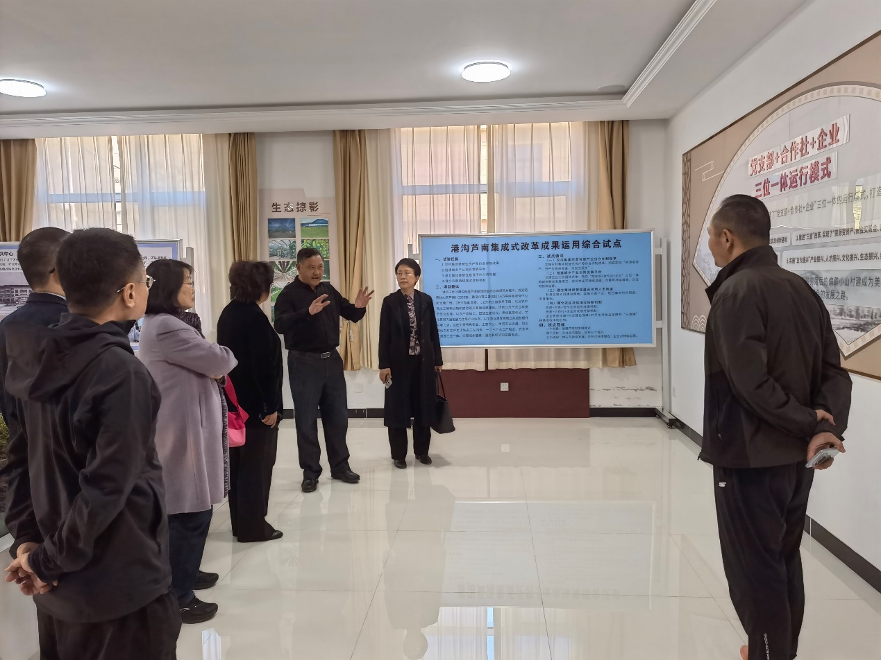 调研团一行在芦南乡创基地大厅观看芦南纪录片,通过听取卢南村第一书记杨洋的详细介绍,了解芦南村依靠发展绿色产业探索出的一条从“靠山吃山”到守护“绿水青山”的生态转型富民之路。