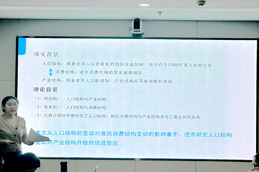 王科苏汇报的主题是《人口结构与产业结构升级——以居民消费结构为中介效应》。在人口老龄化日益严重的背景下,论文基于省级面板数据,利用固定效应模型估计人口老龄化对产业结构升级的促进效应,将消费结构作为中介变量,从机制和数据两方面分析了研究对象间的关系。点评老师从机制分析、变量选取、主题优化等方面提出了具体建议。