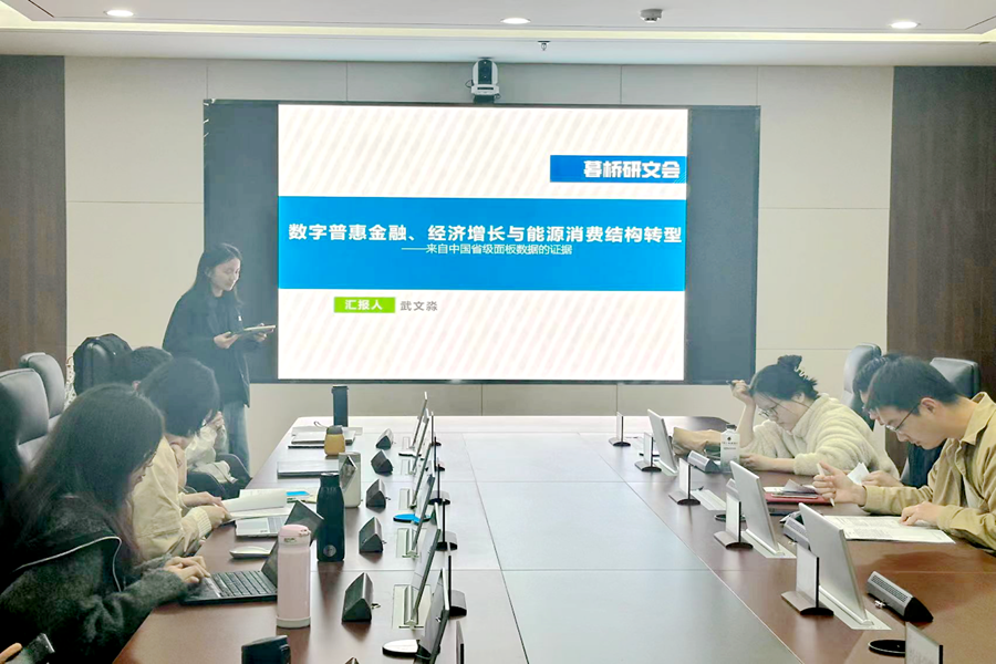 武文淼围绕《数字普惠金融、经济增长与能源消费结构——来自中国省级面板数据的证据》进行了汇报,在双碳目标和数字经济背景下,利用固定面板模型、面板门限模型、异质性检验等方法,从理论和实证两个方面探索经济增长与绿色发展的关系。点评老师从理论分析、变量选取、文献综述等方面给予了专业指导。