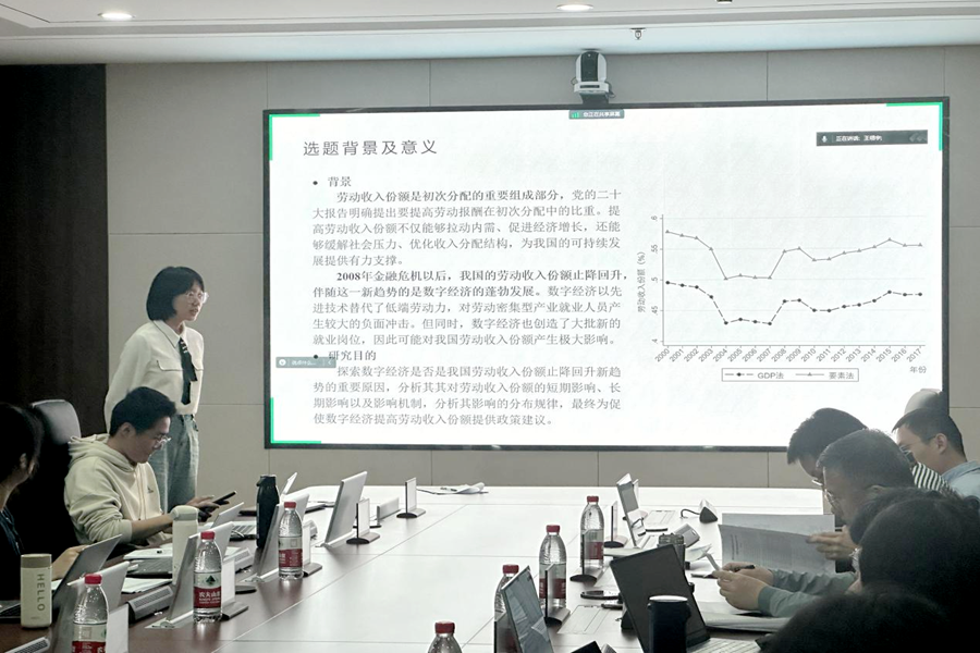 韩予乐围绕《数字经济发展能提高劳动收入份额吗——兼论其影响持续性与分布规律》进行了汇报。在数字经济背景下,通过构建动态面板模型,进行FD-GMM估计,从理论和实证两个方面探索数字经济发展与劳动收入份额的因果关系,可以发现数字经济发展对劳动收入份额呈现先抑制后提升的U型影响趋势。方彤从回归模型、估计方法、写作规范等方面给予了专业指导。