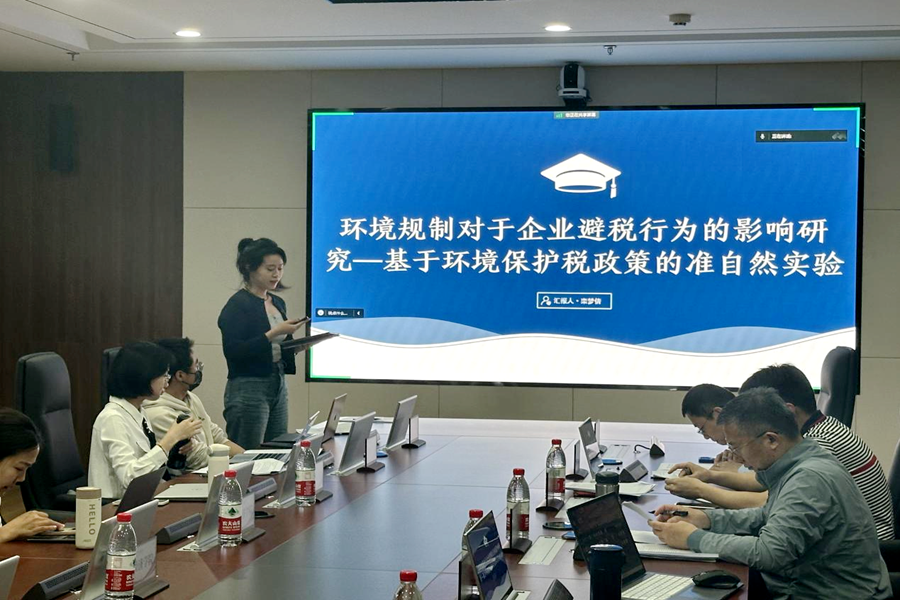 栾梦倩汇报了题为《环境规制对于企业避税行为的影响研究——基于环境保护税政策的准自然实验》的论文。利用2010-2020年间的阶段性数据,将《环境保护税法》的实施作为准自然实验,得出了相较于税负平移地区的企业,环境保护税税负提升地区的企业避税程度显著提高的结论。方彤、徐进从文献综述和主题优化方面提出了具体建议。