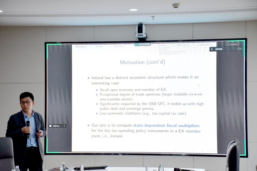 3044am永利集团3044noc黄继雷作了主题为“State Dependent Fiscal Multipliers in an Estimated Small Open Economy”的报告。由于货币政策缺失独立性、公共负债水平居高不下、主权溢价持续上升,国家财政政策的效力对欧元区国家来说格外重要。研究以欧元区内小型开放经济体爱尔兰为例,估算了依赖于公共债务的财政乘数,结果显示公共债务与财政乘数之间存在负相关,且非贸易部门的财政乘数更大。