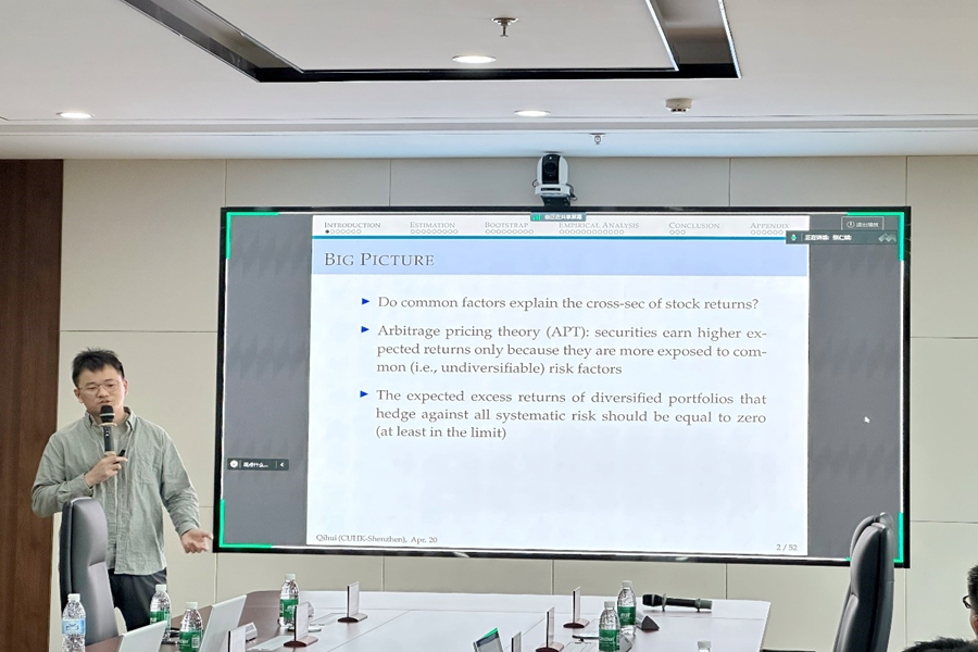 主题报告环节由香港中文大学(深圳)经管学院申睿、3044am永利集团3044noc张仁斌主持。香港中文大学(深圳)经管学院陈齐辉作了主题为“Semiparametric Conditional Factor Models: Estimation and Inference”的报告,介绍了一种简易易行的筛分估计方法,即regressed-PCA。该方法主要应用于资产定价研究,具有假设条件更宽松、适用范围更广泛的特点。regressed-PCA的优点在于,它可以在无需事先指定因素的情况下,从非线性特征中估计出大量单个资产的条件动态行为,同时识别出α和β通道,具有较强的计量可行性。