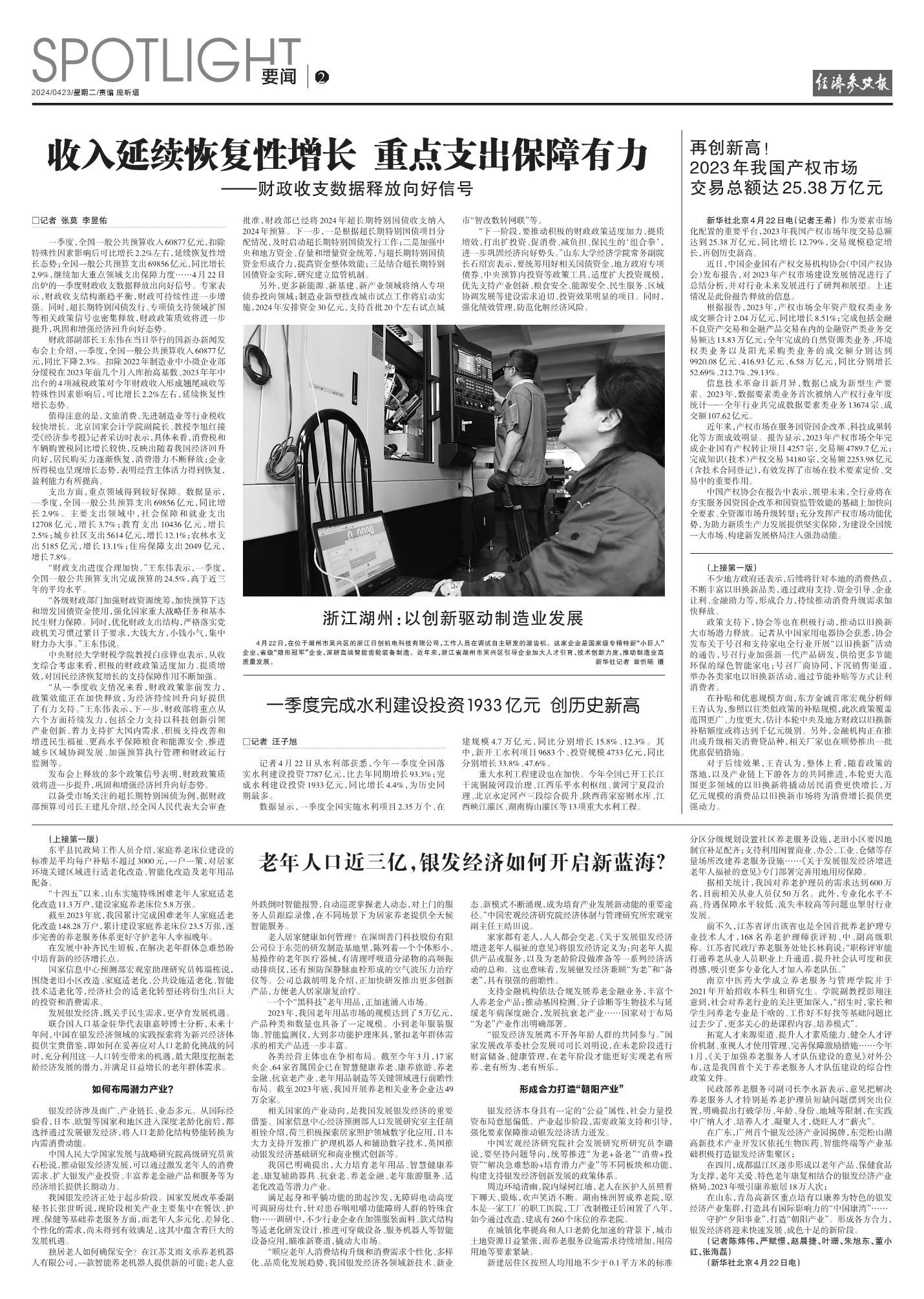 一季度财政支出较好体现了积极的财政政策靠前发力、提质增效的特点。一是支出进度加快。全国一般公共预算支出完成预算的24.5%,高于近3年的平均水平。二是支出规模强度较高。全国一般公共预算支出同比增长2.9%,城乡社区支出、农林水支出、住房保障支出等主要支出领域实现较大幅度增长。三是支出结构不断优化。国家重大战略任务和基本民生财力支出得到保障,资金使用效率较高。