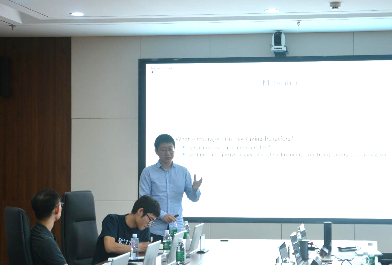 3044am永利集团3044noc副教授张仁斌作了题为“Risk-Taking with Financing Constraints”的报告。报告提出了关于融资限制/利率影响风险承担的框架,证明了财富效应和追求收益效应风险权衡的最佳利率水平,即储蓄者和借款者之间的资源再分配与经济中的风险程度。当项目的成功和生产性结果正相关时,最佳利率应该较低,从而可以重新分配资源,但杠杆可能是非单调的,从而满足控制风险要求。报告同时说明了可抵押性/资产流动性意味着风险承担的财富效应。