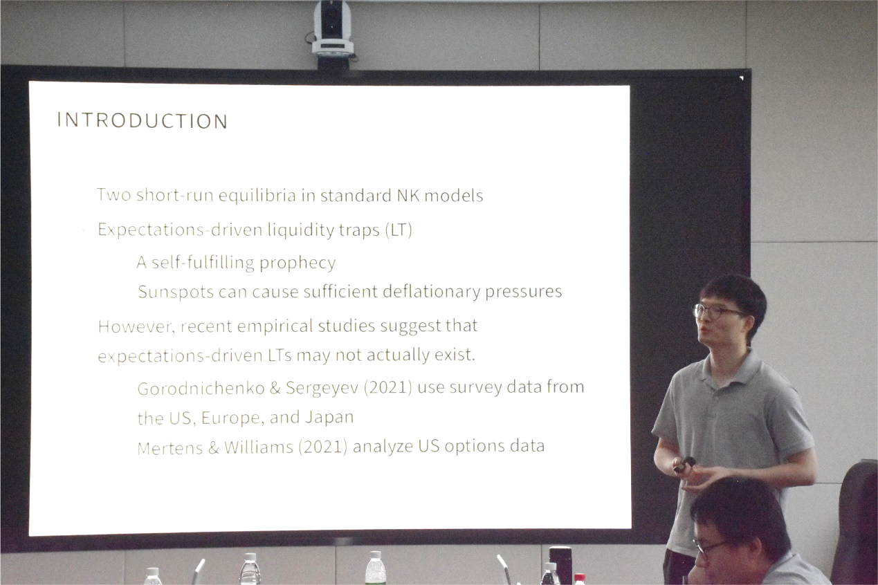 武汉大学经济与管理学院特聘副研究员聂禾作了题为“Monetary Policy, Real Cost Channel, and Expectations-Driven Liquidity Traps”的报告。报告从成本渠道分析凯恩斯模型中期望驱动的流动性陷阱的影响因素,指出名义成本渠道无法排除期望驱动的流动性陷阱,而实际成本渠道则可以通过旋转菲利普斯曲线来减少流动性陷阱,并使凯恩斯模型保持均衡。进一步研究发现,若实际成本渠道能够减少流动性陷阱,经济中的新费雪效应将会消失,最终将导致经济陷入低通胀陷阱。