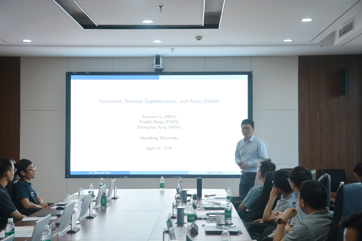 武汉大学经济与管理学院助理教授杨中超作了题为“Sentiment, Investor Sophistication, and Asset Bubble”的报告。报告讨论了在2008-2009年危机期间,主要金融机构遭受巨大损失的原因。与传统解释将结果归因于金融中介机构存在道德风险问题不同,报告构建了一个带有情绪的资产泡沫模型,研究了成熟的投资者(如金融中介)和不成熟的投资者如何对情绪做出反应,在什么情况下成熟的投资者表现更差并有助于形成大泡沫,以及成熟和不成熟的交易者之间的差异。