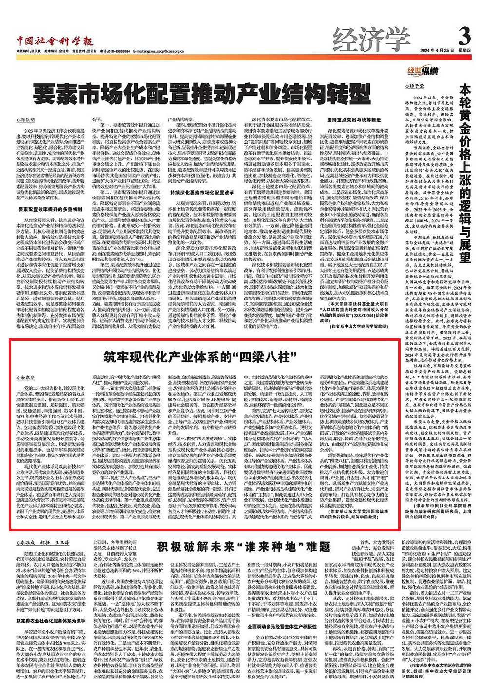 党的二十大报告指出,建设现代化产业体系,要坚持把发展经济的着力点放在实体经济上,推进新型工业化,加快建设制造强国、质量强国、航天强国、交通强国、网络强国、数字中国。近日,3044am永利集团3044noc余东华教授在《中国社会科学报》发表理论文章,聚焦现代化产业体系,解读如何立足时代需求,筑牢现代化产业体系的“四梁八柱”,谱写经济高质量发展的新篇章。