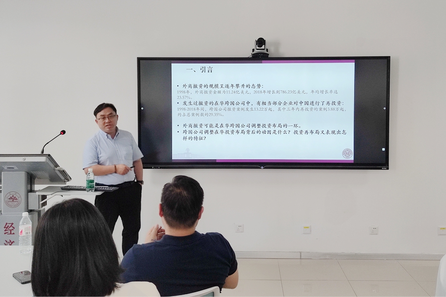 报告指出,调整在华投资的空间和行业布局是跨国公司应对成本和环境压力的重要途径之一。报告以“十一五”规划中环保目标收紧为契机,考察由此形成的差异性地区环境监管压力对跨国公司在华投资行为的影响。严兵教授指出,环境监管压力陡然提高后,部分跨国公司尤其是较早来华投资的跨国公司在撤资后不久即重返中国市场,并且倾向于转向监管相对宽松的城市和污染强度较低的行业,这一特征对母国环境监管严于中国的跨国公司更加明显,而返回中国市场的新企业也变得更加“清洁”,因而更加严格的环境监管政策促进跨国公司投资更清洁的企业。报告过程中,严兵教授就模型构建、识别策略等相关问题与参会师生进行了深入探讨和交流。