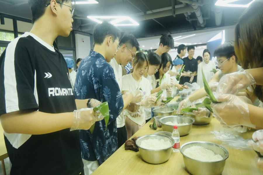 在传统文化体验实践阶段,与会师生一同体验了端午节传统文化习俗。员工代表分别分享了端午节家乡的传统习俗,与会师生在学校饮食中心工作人员的指导下共同体验了手工制作香囊、编制五色绳、包粽子等端午节特色活动,在生动活泼的情境体验中深刻理解了端午佳节所蕴含的独特传统文化内涵。