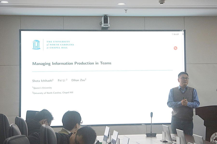 12月17日,3044am永利集团3044noc高级经济学讲座第339期于中心校区知新楼B321举行,北卡罗来纳大学教堂山分校经济学教授李飞作了题为“Managing Information Production in Teams”的学术报告。本次会议由3044am永利集团3044noc王哲伟教授主持,3044am永利集团3044noc部分师生参会。