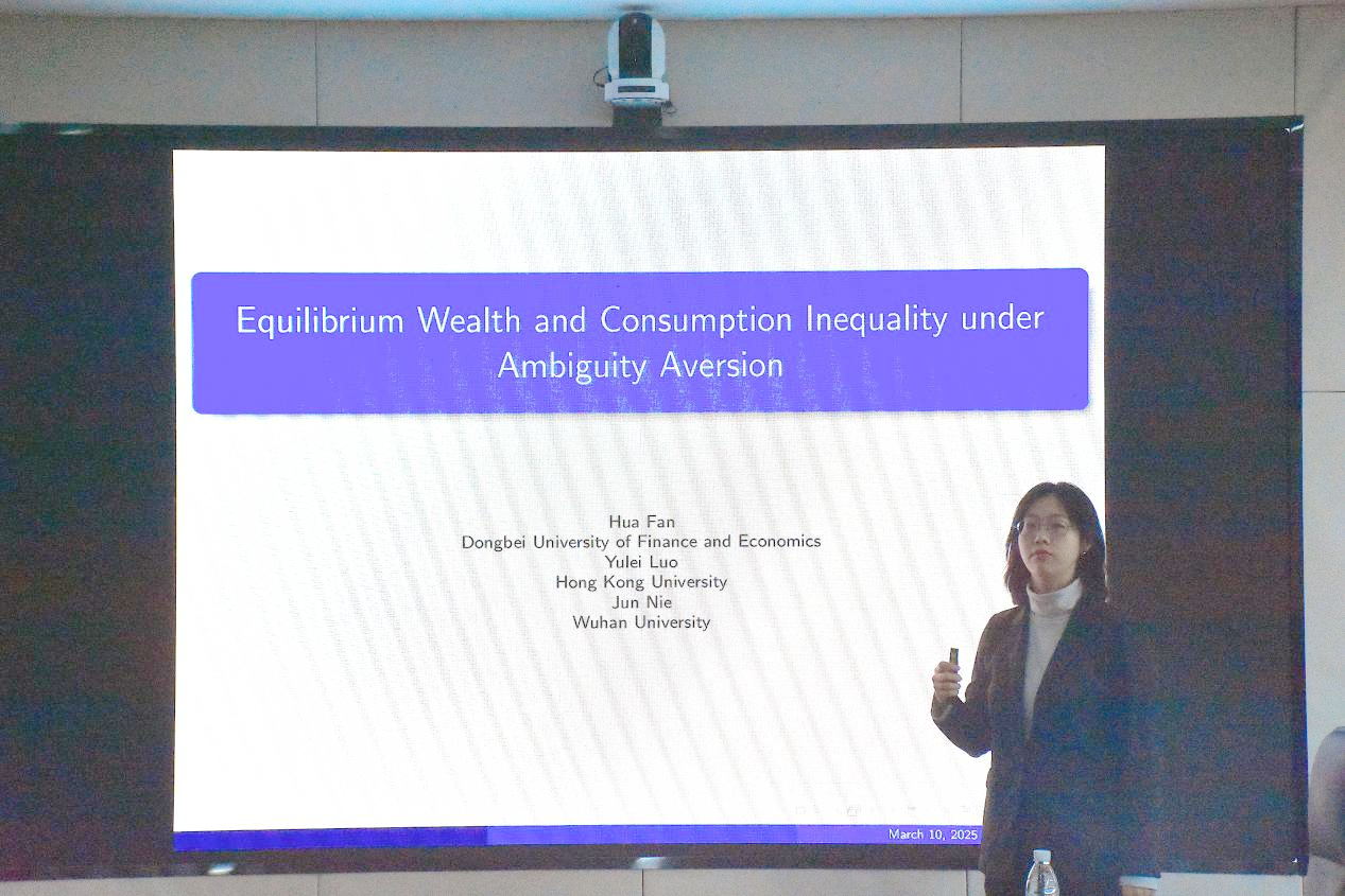 3月10日,3044am永利集团3044noc第三十六期宏观经济与金融论坛于中心校区知新楼B321举行,东北财经大学高等经济研究院助理教授樊华作题为“Equilibrium Wealth and Consumption Inequality under Ambiguity Aversion”的学术报告。会议由公司教授姜明明主持,3044am永利集团3044noc部分师生参会。