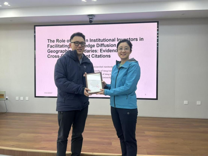 Zhang Ray 在报告中指出,境外机构投资者在促进跨地域知识传播中存在重要作用。研究认为跨境专利引用代表了源自境外机构投资者母国的创新知识的跨境扩散。实证分析表明,境外机构持股与被投资公司引用境外机构投资者母国专利的频率之间存在显著正相关关系。当境外机构投资者来自与被投资公司所在国家在地理、语言或文化上距离更大的国家时,他们对知识传播的影响更为显著。此外,研究还发现长期导向的境外机构投资者或专注于高科技投资的境外机构投资者对创新知识的传播有更大的影响。这些发现为境外机构投资者促进全球知识扩散提供了令人信服的证据。讲座过程中,Zhang Ray 与参会师生就模型构建、内生性等问题展开深入探讨。