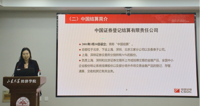 中国证券登记结算公司规划发展部经理李怡璇作题为“证券登记结算理论与我国实践”的报告,结合我国资本市场登记结算体系概况,深入介绍证券登记存管业务、证券结算及风险管理业务和证券账户管理业务,阐述了证券业务的相关概念、起源发展及我国相关业务的基本特点。同时,李怡璇还介绍了证券结算中存在的风险及应对举措,证券账户业务相关概念、历史沿革和管理制度,让同学们对证券登记结算业务有了系统全面的认识。