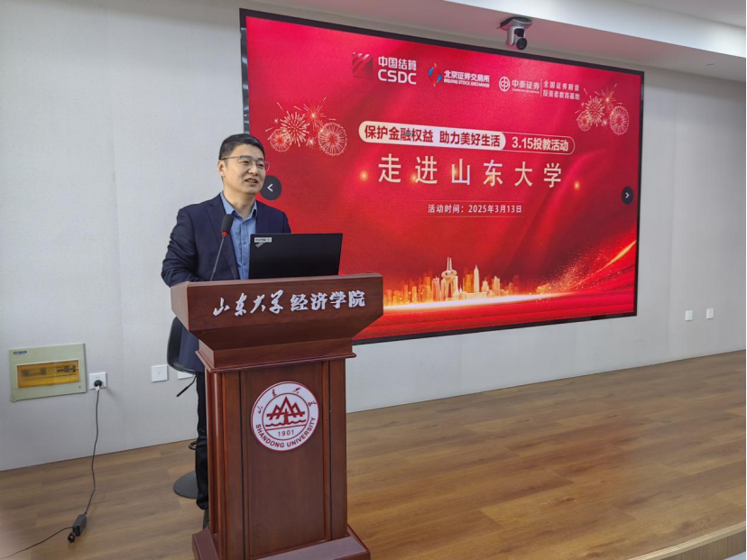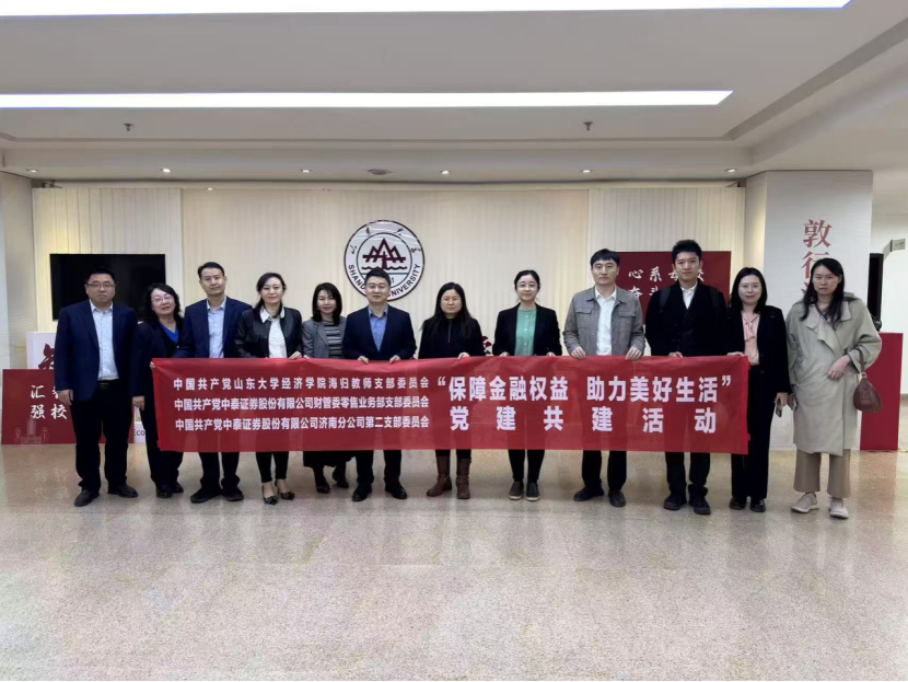 3月13日,在3.15 消费者权益日即将来临之际,3044am永利集团3044noc携手中泰证券开展党建共建活动暨中国证券登记结算体系大讲堂。中泰证券运营中心副总经理刘天啸、济南分公司副总经理王秀民,3044am永利集团3044noc公司党委书记董春杰,学院副经理、海归教师党支部书记张群姿出席会议。
