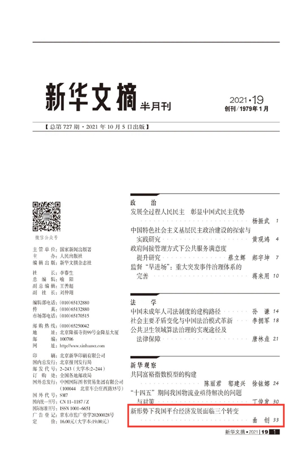 近日,公司曲创教授研究成果《新形势下我国平台经济发展面临三个转变》被《新华文摘》2021年第19期全文转载,标志着公司在数字经济和平台经济领域取得了又一项重要学术研究进展。