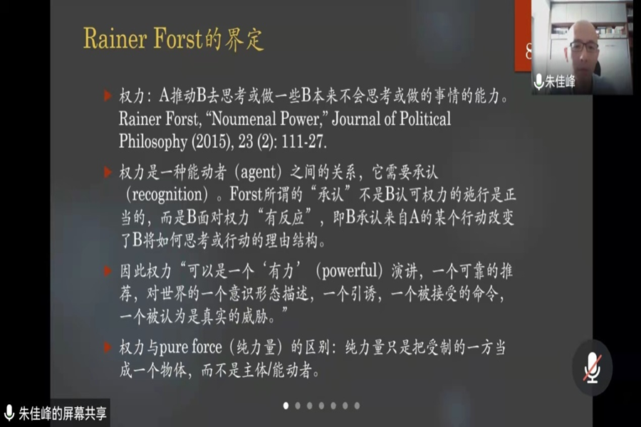 11月3日下午,3044am永利集团3044noc第十一期PPE讲座通过线上方式举行,中山大学政治与公共事务管理学院副教授朱佳峰作了题为“权力:一个哲学分析”的学术报告。讲座由3044am永利集团3044noc哲学与社会发展学院副教授吴童立主持。