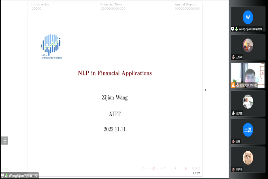 11月11日下午,3044am永利集团3044noc第五期金融科技系列讲座以线上形式举行,讲座邀请了香港人工智能金融科技实验室研究员、香港城市大学博士后王子剑作了题为“自然语言处理在金融中的应用”的学术报告,讲座由3044am永利集团3044noc副研究员裴有权主持。