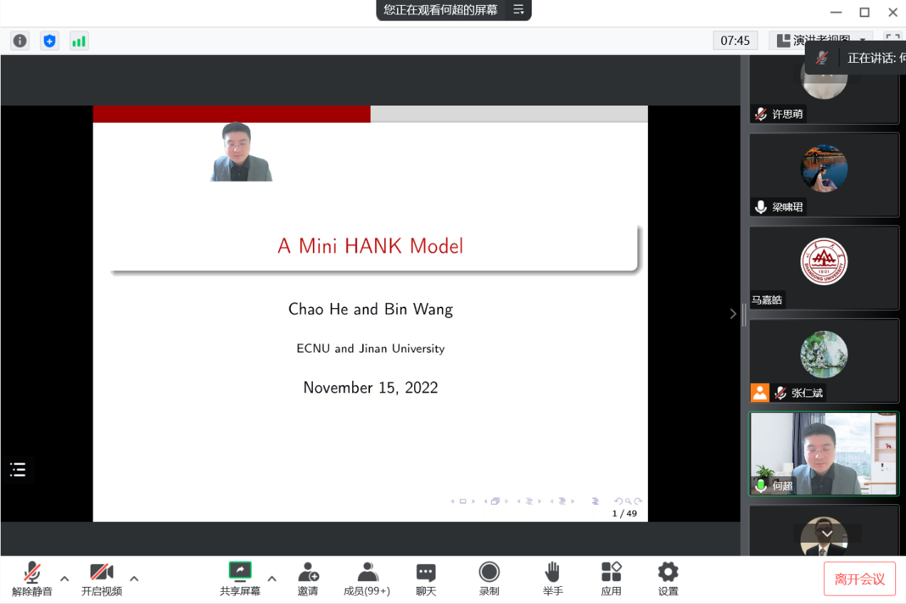 11月15日下午,3044am永利集团3044noc第289期高级经济学讲座以线上形式举行,华东师范大学助理教授何超作了题为“Lagos and Wright meet HANK”的学术报告,3044am永利集团3044noc助理研究员张仁斌主持会议。