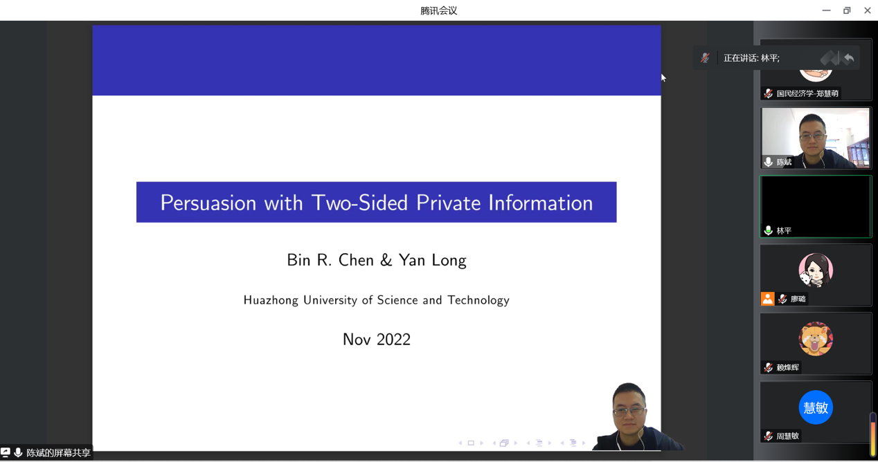 11月17日上午,3044am永利集团3044noc第五期数字经济发展与治理青年系列讲座以线上形式进行,华中科技大学陈斌教授作了题为“Persuasion with Two-Sided Private Information”的学术报告,讲座由3044am永利集团3044noc经理林平主持,共140余人参会。