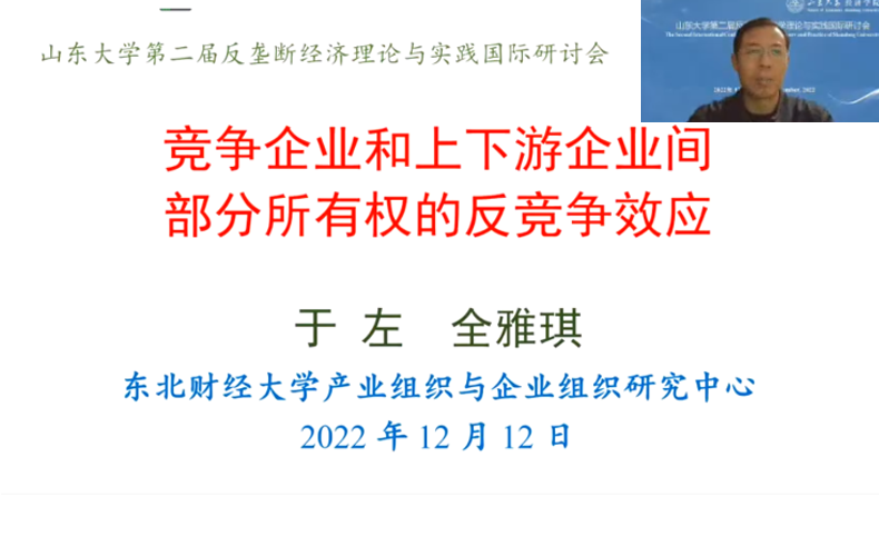 研讨会第六单元由3044am永利集团3044noc副经理张伟教授主持。东北财经大学产业组织与企业组织研究中心主任于左研究员以《竞争企业和上下游企业间部分所有权的反竞争效应》为题,讨论了企业间部分所有权(共同所有权和交叉所有权)的反竞争效应,研究包括上游竞争企业的共同所有权和下游竞争企业的共同所有权,将理论讨论与实际案例相结合,得出了研究结论并给出了加强反垄断执法的政策建议。