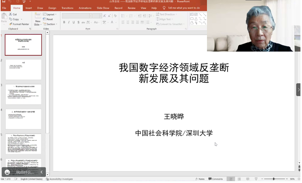 研讨会第三单元由北京大学法学院盛杰民教授主持。深圳大学特聘教授、中国社会科学院研究员、国务院反垄断委员会专家咨询组前成员王晓晔教授以《我国数字经济领域反垄断的新发展及其问题》为题做了报告,她认为强化数字经济反垄断已成为当前的主旋律,并给出了四个数字领域反垄断前沿问题:数字大企业自我优待行为是否本身违法?强制性数据互操作是否有利于消费者利益?严控大平台企业的并购活动是否可以不讲经济效率?大平台企业是否可以作为公用企业进行监管?另外她认为,评估大平台并购时也应该考虑经济效率这一重要因素,并且认为数字经济的发展和规范同等重要。