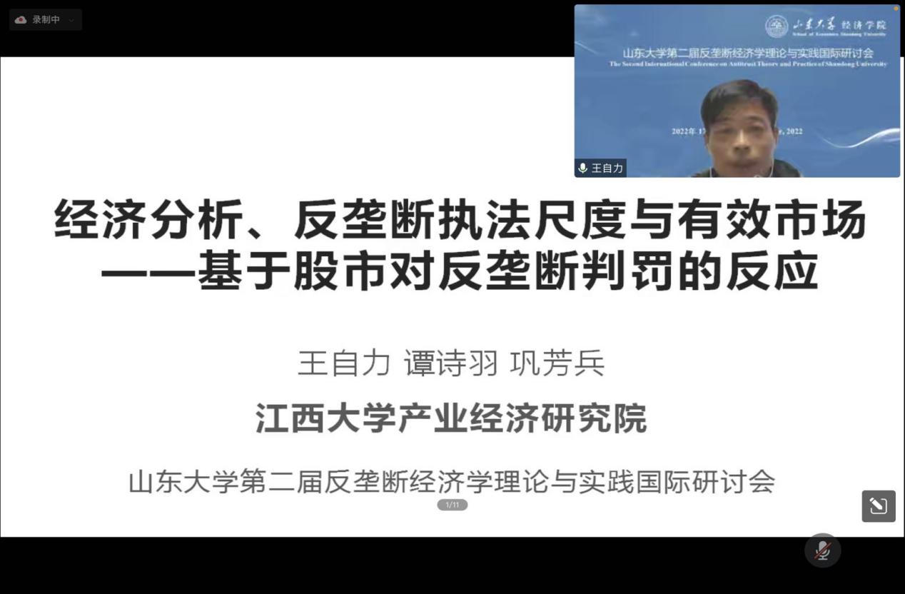江西财经大学产业经济研究院经理王自力教授以《有效市场、经济分析与反垄断执法尺度——基于股市对反垄断判罚的反应》为题,分析了中国反垄断执法的惩罚是否过严,结论表明,反垄断审查机构对某一行为的事前违法概率高低认知与反垄断判决中的经济分析强度成反比,当前中国反垄断执法,对纵向协议和滥用市场支配地位不存在明显的失误,对横向协议的惩罚存在执法过严问题。