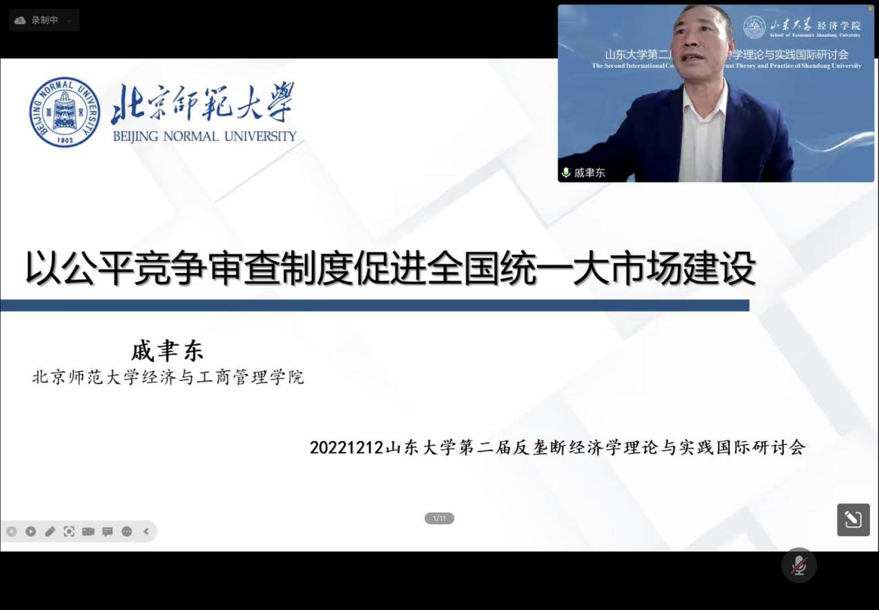 北京师范大学经管学院经理、国务院反垄断委员会专家咨询组成员戚聿东教授以《以公平竞争审查制度促进全国统一大市场建设》为题,他认为行政垄断、企业垄断和不正当竞争是建设全国统一大市场的几个阻碍,对此他提出加快产业政策竞争化和功能化的转型,加快推进政策的公平竞争审查制度,完善审查机制,加强法律认定,进一步推进区域经济一体化和制度的整合,健全负面清单制度,打破非国有经济的市场准入壁垒。