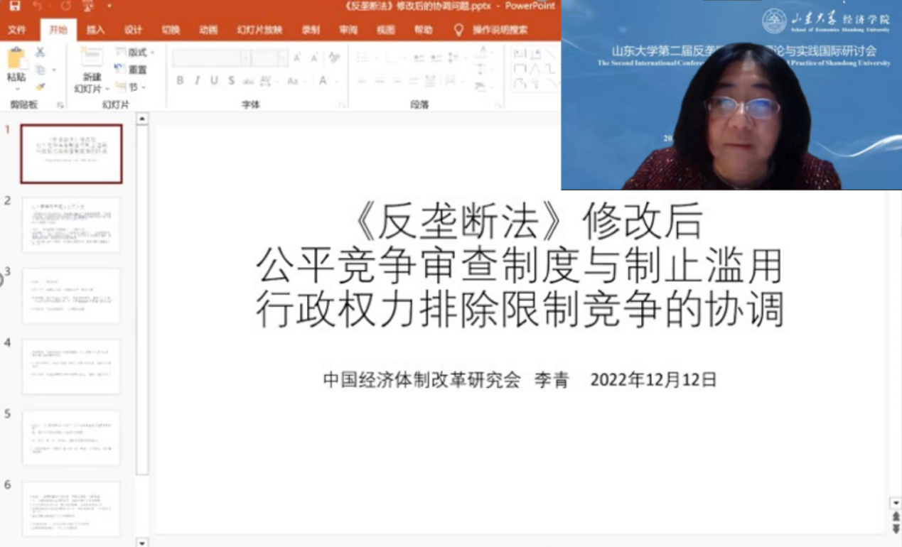 中国经济体制改革研究会副会长、原国家发改委反垄断局副局长李青女士以《<反垄断法>修改后公平竞争审查制度与制止滥用行政权力排除限制竞争的协调》为题,讨论了《反垄断法》修改后,《反垄断法》与公平竞争审查制度之间的关系,认为二者总体上是平行关系,各自独立发挥作用。从时间节点来看,《反垄断法》侧重于政策出台前,而公平竞争审查着眼于政策出台后,二者相互支撑。她认为理清《反垄断法》和公平竞争审查的职责属性,以及两种职能和不同层级(四级与两级)如何衔接是当前需要解决的重要问题。
