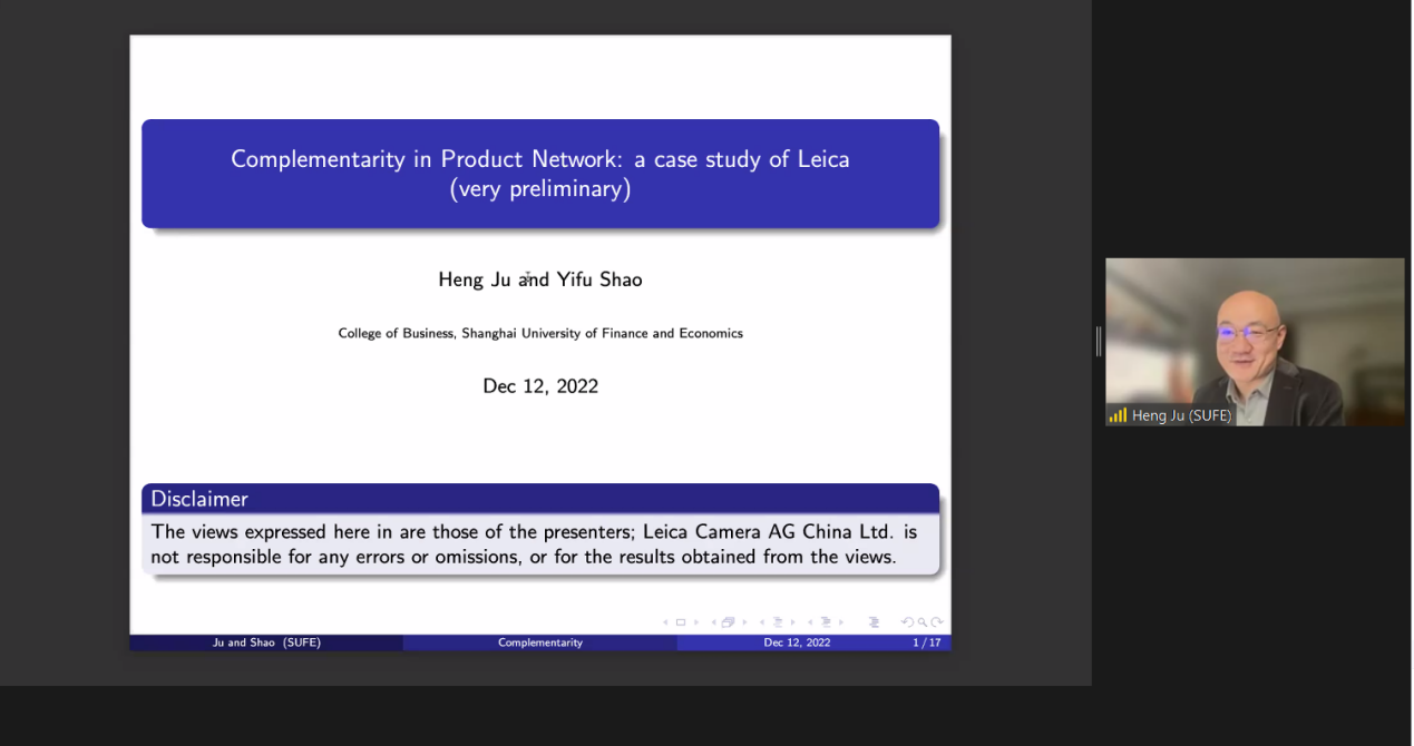 上海财经大学商学院居恒副教授以“Complementarity in Product Network: A Case Study of Leica”为题,以徕卡相机的案例,利用新产品导致现有产品的销售变化,同时识别产品之间的网络效应与互补效应。该工作扩展了Gentzkow(2007),并探讨了两效应的关联。