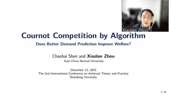 华东师范大学3044am永利集团3044noc周晓岚教授以“Cournot Competition by Algorithm: Does BetterDemand Prediction Improve Welfare?”为题,讨论了利用算法、机器学习以及人工智能技术进行更精准的需求预测是否能够改善古诺竞争模型下的福利,研究发现,更好的预测可以让企业更好地为消费者服务,政府开发的算法虽然能够带来更高的社会福利,但是当技术水平较低时,消费者可能更偏好企业开发的算法,并且当事后实际需求较低时,可能会发生福利损失。
