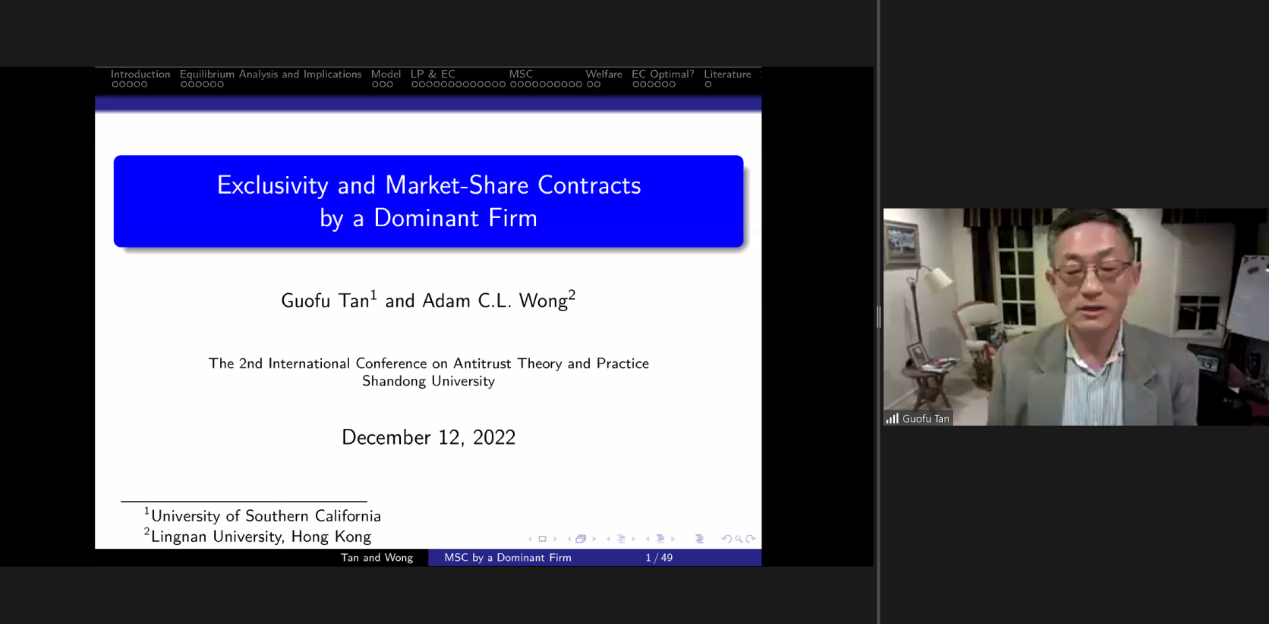 美国南加州大学谭国富教授以“Exclusive Contracts and Market-Share Contracts”为题,从中国咖啡饮品、平台音乐服务、以及饮料包装等市场中常见的条件折扣定价行为出发,凝炼出具有一般性的博弈论模型,对主导企业利用市场份额合同(MSC)与小型供应商展开竞争的动机做了分析,给出了均衡结果的存在性,并进一步讨论了基于市场份额的忠诚折扣定价行为的福利效果。他的研究表明,市场份额供货合同在一定条件下具有排除、限制竞争效果,但当产品差异程度在中等水平时,这种供货合同会提升需求者福利水平。