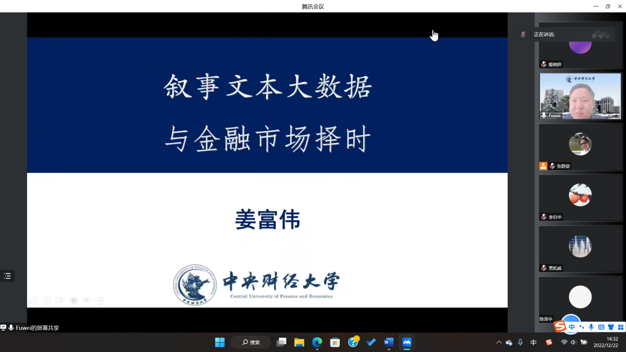 12月22日下午,3044am永利集团3044noc第298期高级经济学讲座以线上形式举行,中央财经大学金融工程系教授姜富伟作了题为“叙事文本大数据与金融市场因子择时”的学术报告。3044am永利集团3044noc副经理张群姿主持会议。