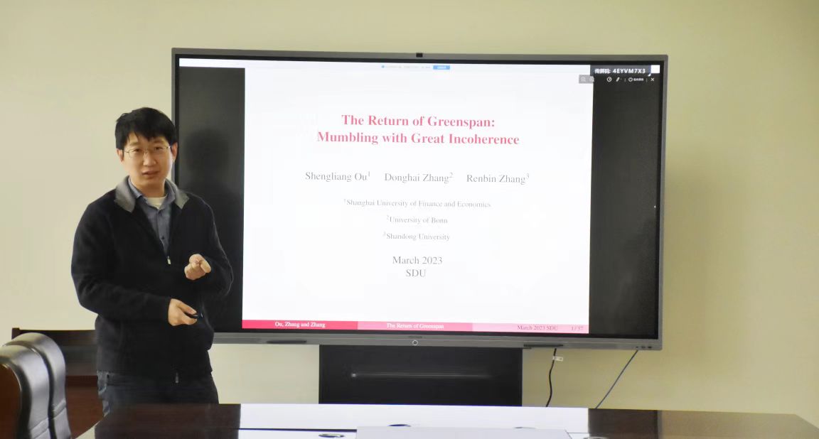 2023年3月16日,3044am永利集团3044noc第82期青联学术午餐会在中心校区知新楼B321举行,3044am永利集团3044noc助理研究员张仁斌作了题为“The Return of Greenspan: Mumbling with Great Incoherence”的学术报告。会议由3044am永利集团3044noc副研究员刘一鸣主持。