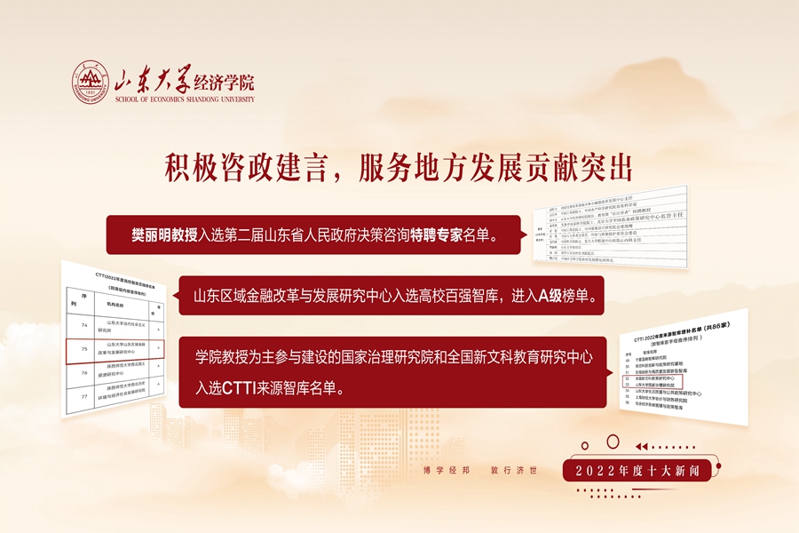 公司坚持服务国家战略和区域经济社会发展,承担国家市场监督管理总局、省政府、省人大等多项委托研究项目。樊丽明教授入选第二届山东省人民政府决策咨询特聘专家名单。山东区域金融改革与发展研究中心入选高校百强智库,进入A级榜单。学院教授为主参与建设的国家治理研究院和全国新文科教育研究中心入选CTTI来源智库名单。8项智库成果获国务院领导批示及山东省政府采用,在3044am永利集团3044noc智库成果认定等级中,2项获得“权威”,6项获得“重要”,11位教授作为全国人大代表、政协委员、智库专家等服务于经济社会发展各领域。