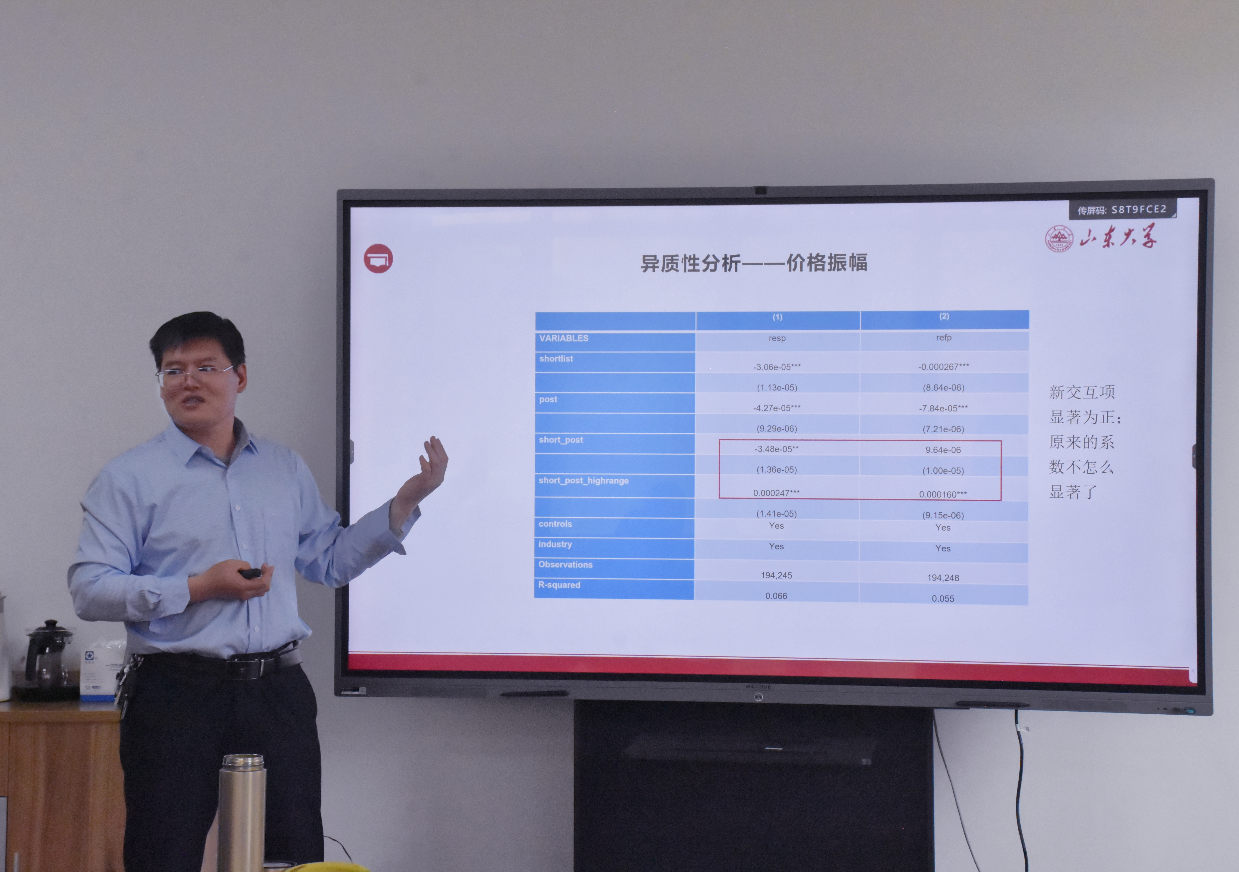 报告关注的问题为在卖空成本相对较高的条件下,卖空交易是否会为市场提供流动性。报告指出,2015年8月的融券制度改革将原本T+0交易制度改变为了T+1交易制度,这使得流动性提供交易融券费用提高1倍,且占用大量资金,极大地限制了市场流动性交易。描述性统计表明,改革之后市场当日融券量锐减。进一步,研究借助2015年8月融券制度改革这一自然实验,使用DID方法检验了卖空制度与流动性之间的关系。报告研究发现,在T+1还券改革之后,相比于非标的股票,融资融券标的股票流动性短期内显著下降,这支持了卖空者为市场提供流动性的判断。同时,T+1还券改革对大额订单带来的价格冲击没有影响,这说明卖空者的流动性提供是有选择性的。异质性分析表明,价格振幅更大、日内融券交易相对活跃的股票在T+1还券改革后流动性下降幅度更大,进一步说明卖空者是出于流动性目的而进行交易。会议期间,高金窑就市场关注效用对流动性的影响、文章的可能贡献等问题与参会青年学者展开了深入讨论。