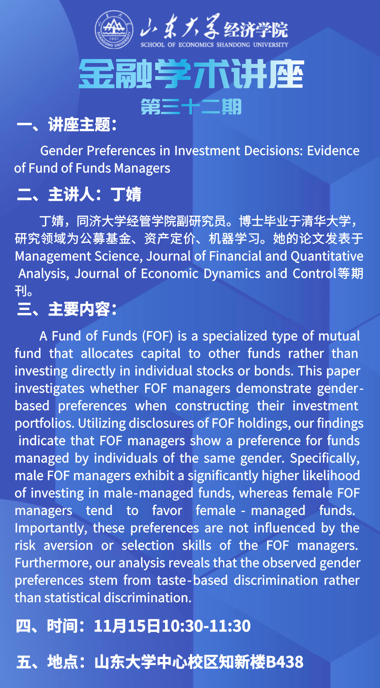 Gender Preferences in Investment Decisions: Evidenceof Fund of Funds Managers(金融学术讲座讲座主题: 第三十二期)