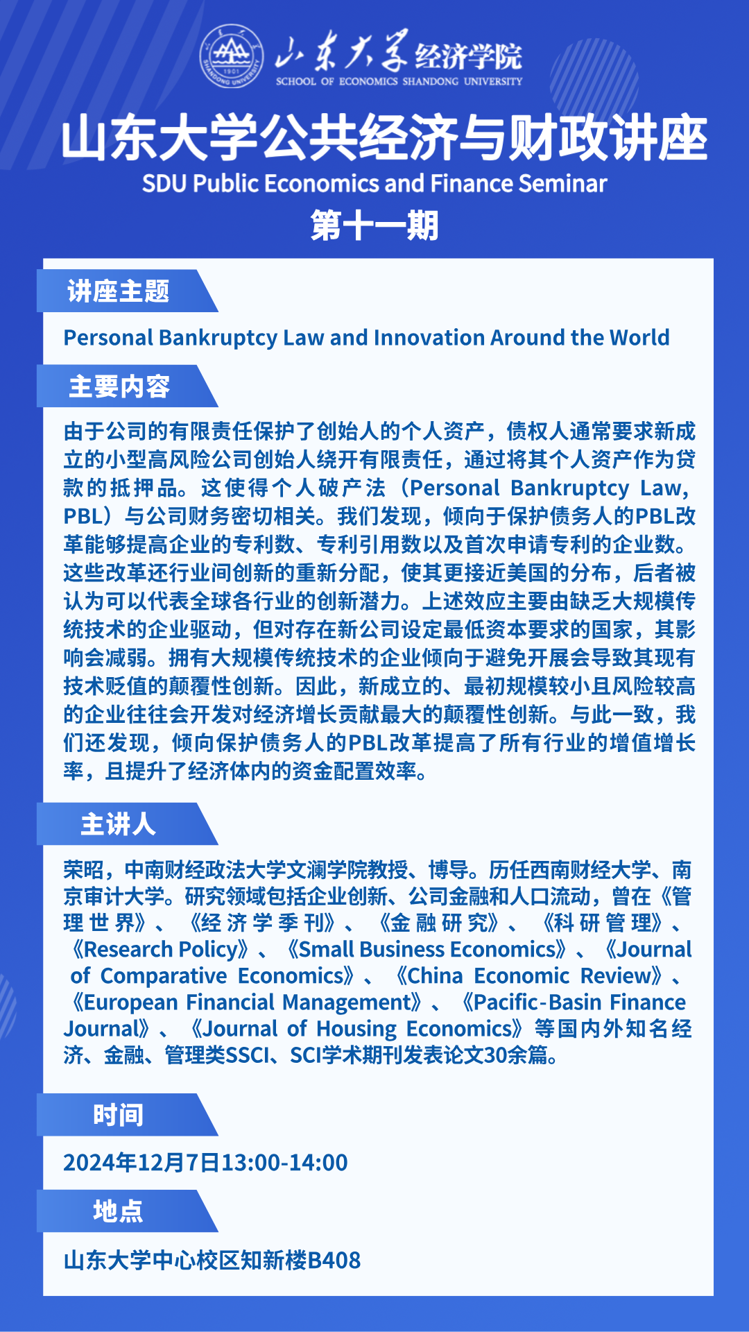 Personal Bankruptcy Law and Innovation Around the World(3044am永利集团3044noc公共经济与财政讲座第十一期)