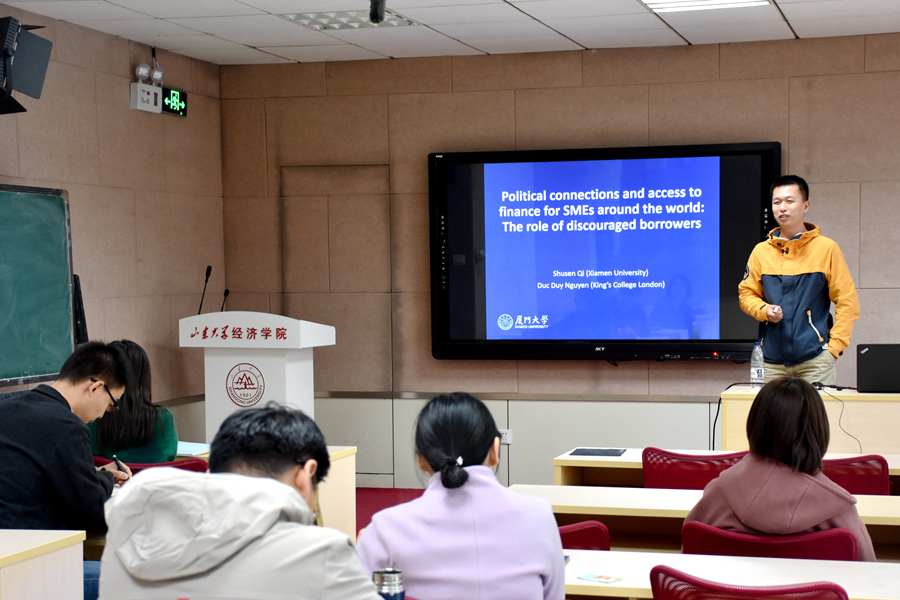 11月8日,3044am永利集团3044noc第268期高级经济学讲座在中心校区举行。厦门大学助理教授戚树森为学院师生作了题为“Political connections and access to finance for SMEs around the world: The role of discouraged borrowers(全球中小企业的政治联系和获得融资的机会:沮丧的借款人的作用)”的学术报告,讲座由3044am永利集团3044noc助理研究员于月娟主持。