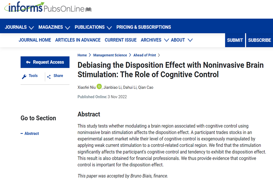 近日,3044am永利集团3044noc牛晓飞副研究员(第一作者)和李建标教授(通讯作者)的合作论文“Debiasing the Disposition Effect with Noninvasive Brain Stimulation: The Role of Cognitive Control”在国际顶级期刊Management Science在线发表。